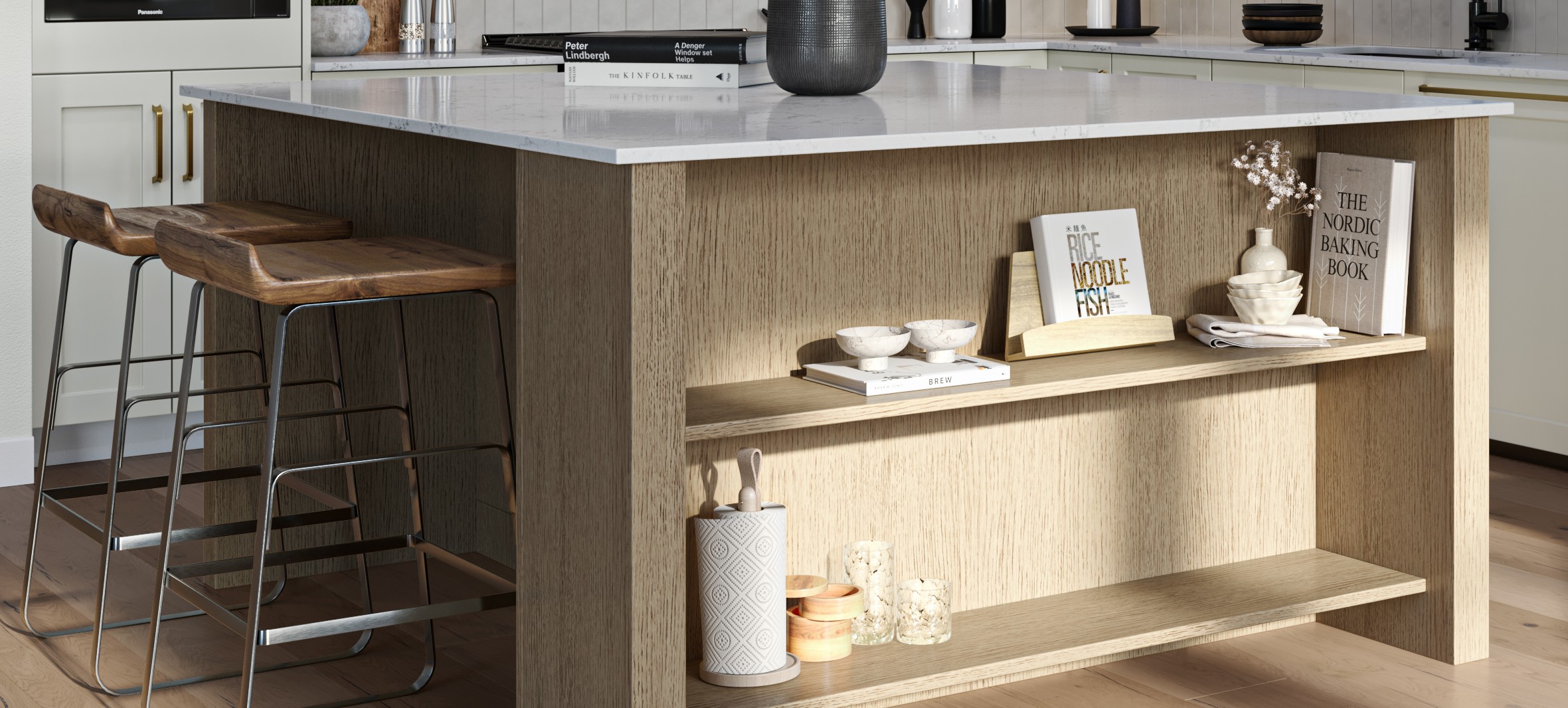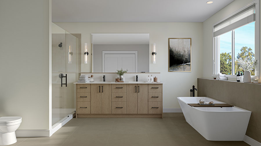 Modern kitchens are bright and inviting, blending warm off‑white cabinetry and custom white oak elements. Enjoy large islands with open shelving detail, and the convenience of a walk-in pantry or optional spice kitchen.